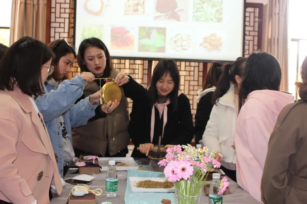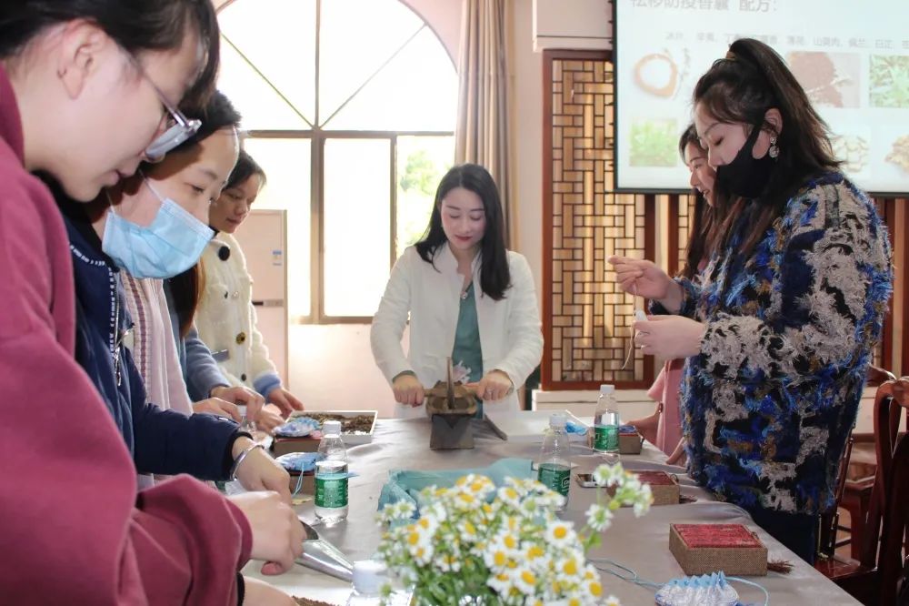 活动现场邀请了专业的香道老师为大家做香道品鉴分享。在对香文化、香料识别、香囊介绍、香囊历史、香囊材质、香囊用途及功效等进行了初步的讲解之后,老师便向我们传授了独家的祛秽防疫香囊配方。