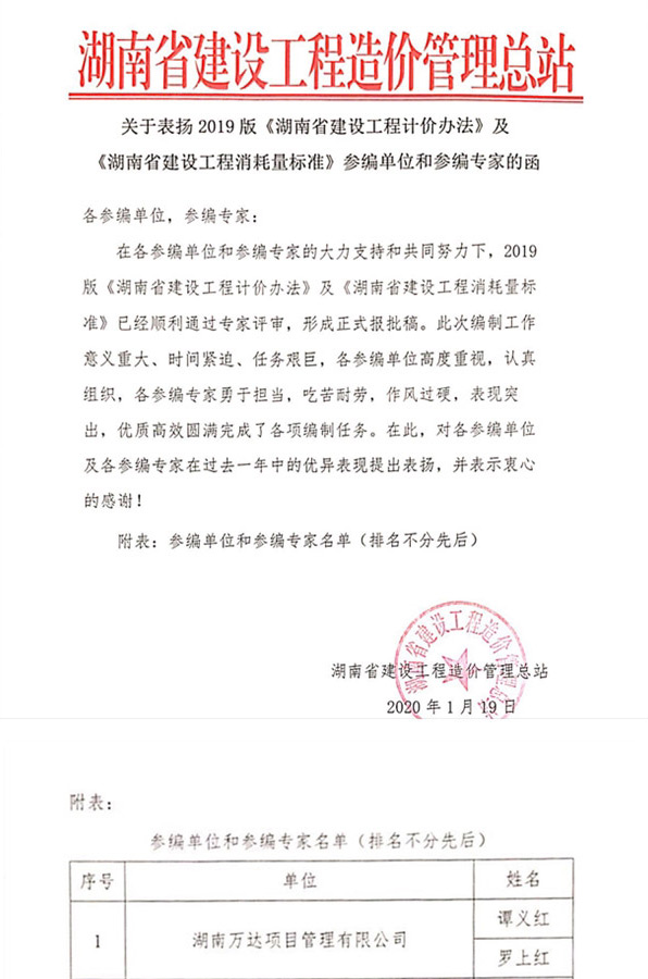 1月19日,我司收到一封特别珍贵的信函,这是一封来自湖南省建设工程造价管理总站的表扬函。